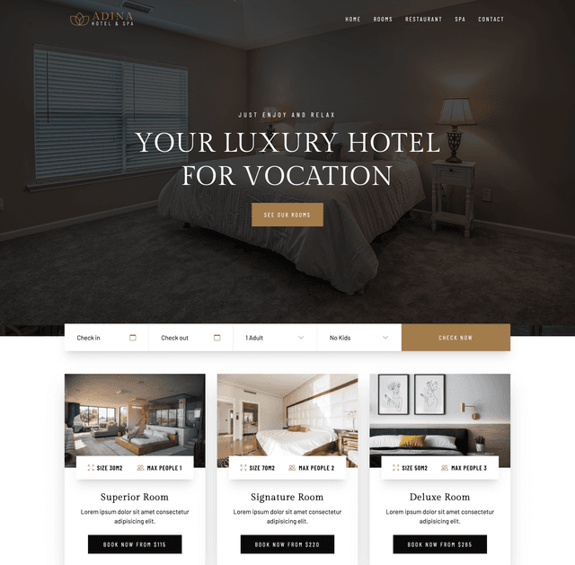 'Adina Hotel' is a website application that provides hotel room booking services with a variety of room types